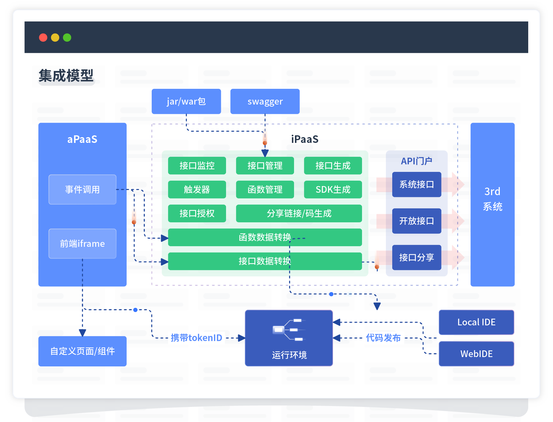 集成模型包括平台本身前、、、、、、、、后端能力的扩展,,,,,,,,,也支持通过API门户和第三方系统进行交互。。。。。。。。。