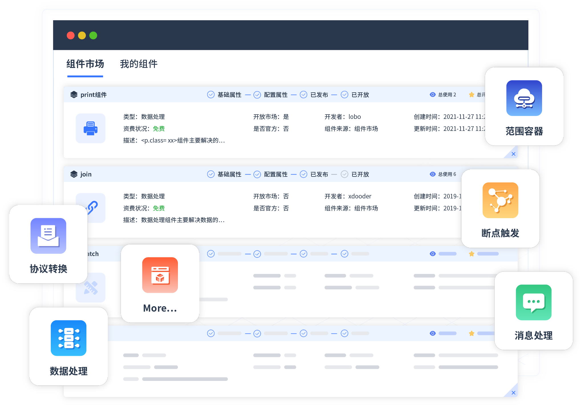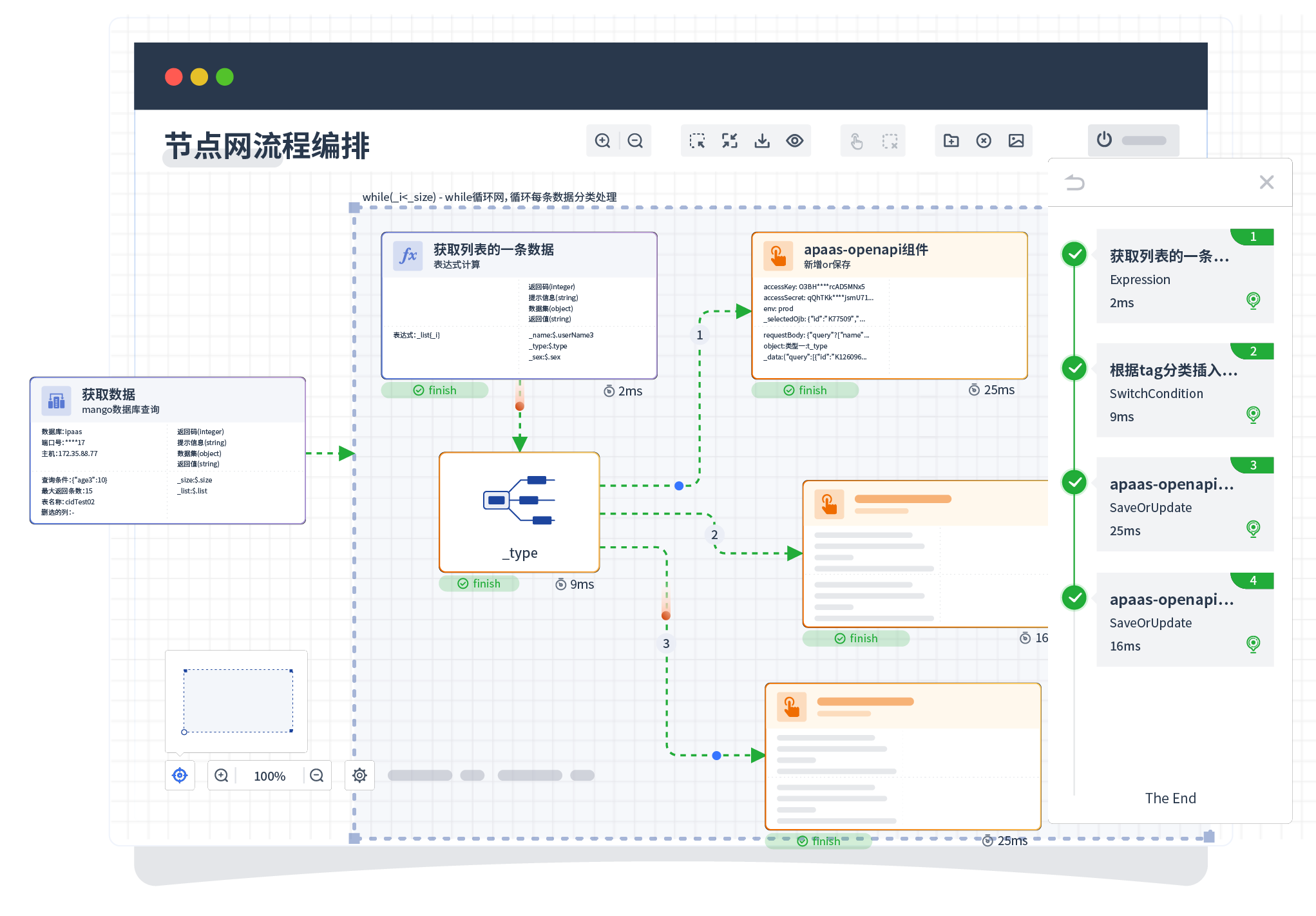 针对集成场景,,,,,,,,,,,组件定义后支持进行流程编制,,,,,,,,,,,,不同于传统代码方式,,,,,,,,,,,通过图形化展示,,,,,,,,,支持在线调试、、、、、、、、、日志查看和运行回放。。。。。。。。。